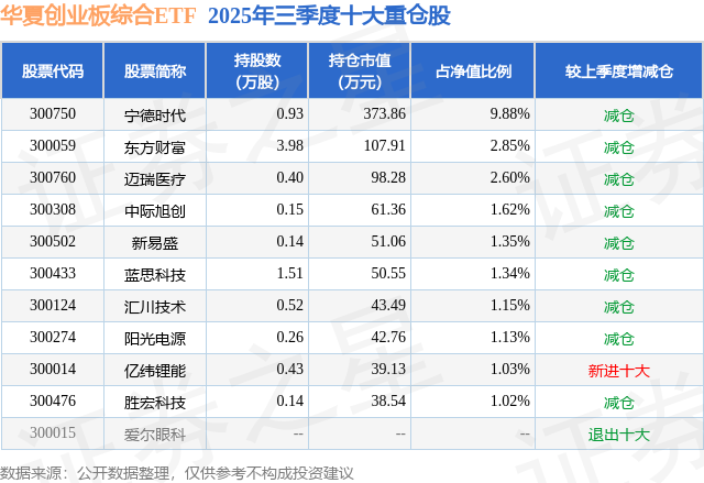 从基金规模来看,中原创业板概述ETF基金2025年三季度公布的基金规模为0.38亿元,较上一期规模4321.67万元变化了-537.74万元,环比变化了-12.44%。该基金最新一期钞票树立为:股票占净值比98.45%,无债券类钞票,现款占净值比1.76%。从基金抓仓来看,该基金当季前十大股票仓位达23.97%,第一大重仓股为宁德期间(300750),抓仓占比为9.88%。